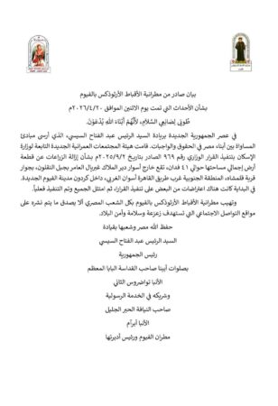 أصدرت مطرانية الأقباط الأرثوذكس بالفيوم بيانًا رسميًا لتوضيح الحقائق بشأن الأحداث التي جرت، وأكد البيان أن هيئة المجتمعات العمرانية الجديدة، التابعة لوزارة الإسكان، قامت بتنفيذ القرار الوزاري رقم (969) الصادر بتاريخ 2 سبتمبر 2025، والقاضي بإزالة زراعات عن قطعة أرض تبلغ مساحتها حوالي 41 فداناً.