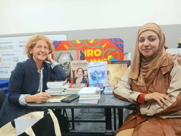 على منضدة عامرة بالقصص المترجمة وصور شهيرة لمؤلفين رائجين ومنهم صاحبة “هاري بوتر”، جلست السيدة سيلفيا فازينا، الناشرة الإيطالية ومؤسسة دار “أكوما”، لتجري نقاشات مع ناشرين في القاهرة حول تبادل حقوق الملكية والترجمة لعناوين جديدة متبادلة.